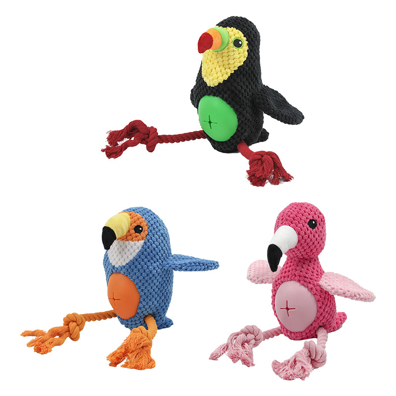 A parrot-shaped dog toy with squeaker and crinkle paper